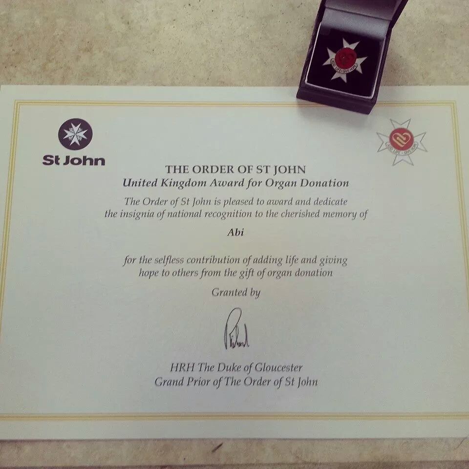 [Note 2: We also found out a week after Abi’s death that she had debated organ donation in her Science class at school only recently, and had produced an ‘impressive’ piece of work on the benefits of organ donation. This was naturally a great comfort to us, to confirm that we had made the right decision for her.]
