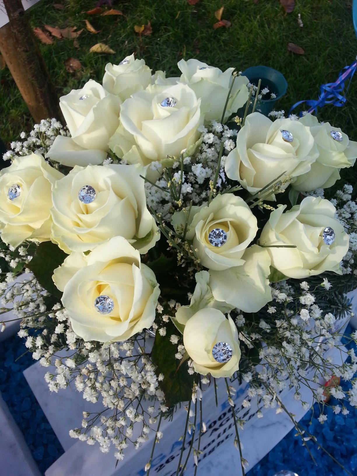 I often choose roses in bright colours, particularly the orange that Abi looked great in, or yellow for her sunny smile, or pure white. I buy two or three bunches and share them between her memorial and home. I usually get them from the supermarket but on special days I’ll buy a handmade display from our fabulous local florist.